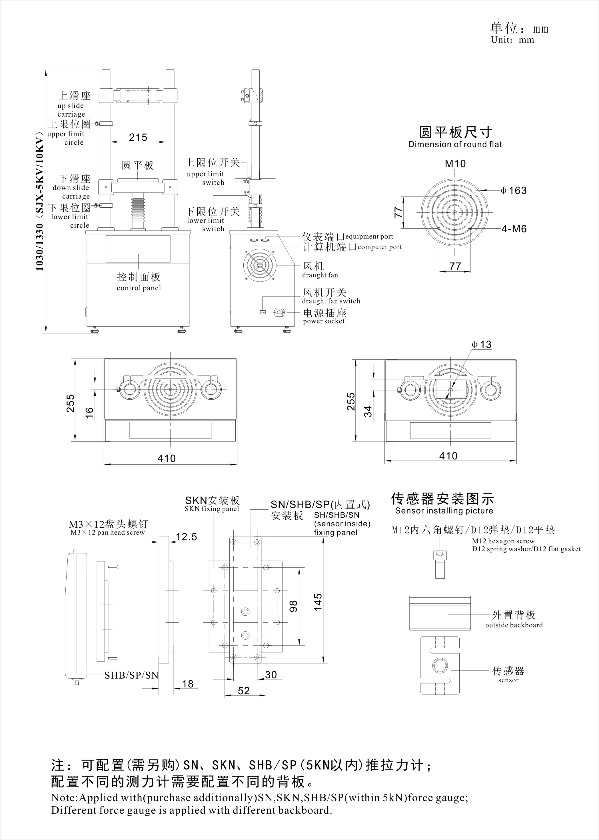 SJX-5KV電動立式機臺采用雙立柱結構,具有穩定性好,適用范圍廣,使用方便等優點,并具有無級調速,手動(電動)、自循環切換功能可預設定往復測試次數。與SHB配套可預設定自動停機負荷。配備推拉力計,適用于各種推拉負荷的拉壓負荷、插拔力、疲勞試驗、破壞試驗等測試。